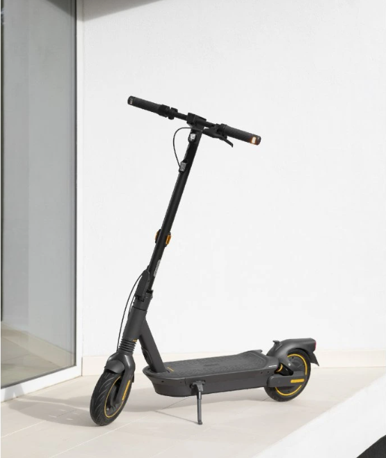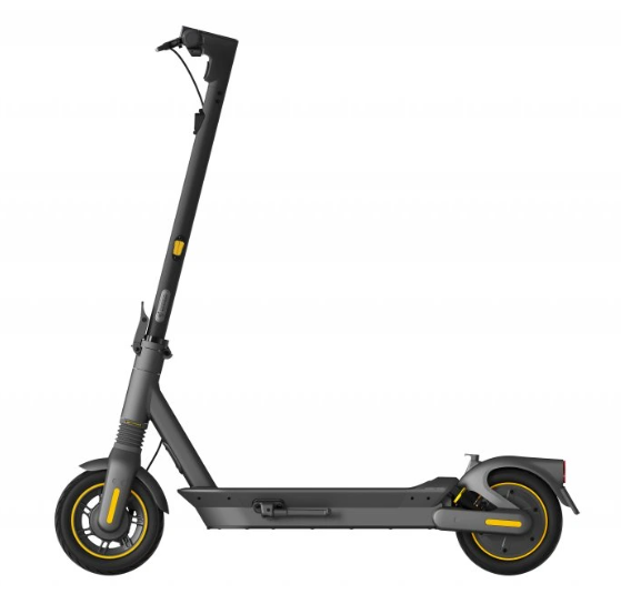 The MAX G2 E design combines a robust structure, practicality, and modern aesthetics. When unfolded, the scooter measures 1210 × 570 × 1264 mm, ensuring a stable riding stance even for taller riders. When folded to a more compact size of 1210 × 570 × 605 mm, it can be conveniently stored in an apartment or garage, or transported in a car trunk. The weight of about 24.3 kg is higher compared to typical city models, but it reflects the solid construction that delivers high durability, stability, and long service life. The MAX G2 E features large 10-inch self-healing (self-sealing) tubeless tires, which reduce the risk of punctures and increase comfort over rough surfaces. One of the biggest advantages of this model is the combination of a front hydraulic damper and rear dual spring suspension, making the MAX G2 E one of the most comfortable scooters in its class. High-performance LED lights are complemented by integrated turn signals, improving both visibility and communication with other road users. There is also a modern color display showing speed, range estimate, battery level, and the active mode. Bluetooth connectivity and control via the mobile app come as standard, where you’ll find ride mode settings, the scooter lock, and diagnostics. A three-step folding mechanism enables quick handling, and the overall equipment makes the MAX G2 E one of the best-equipped models in its category.