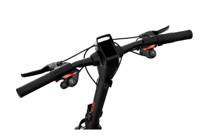 The GT3 E keeps the distinctive aggressive GT-series styling while introducing smoother curves and optimized ergonomics for everyday commuting. The frame is made of aircraft-grade aluminum, providing rigidity and low vibration even under heavy load. The scooter measures 1375 × 680 × 1377 mm, ensuring a stable riding position, and when folded stands only 700 mm high – perfect for transport by car or public transit. The control panel features wide handlebars with a central TFT display showing speed, mode, battery status, and motor temperature. The GT3 E offers several riding modes (Eco, Standard, Sport), switchable with a single button. It includes integrated front and rear LED lights, a brake light, side reflectors, and ambient lighting for improved night visibility.