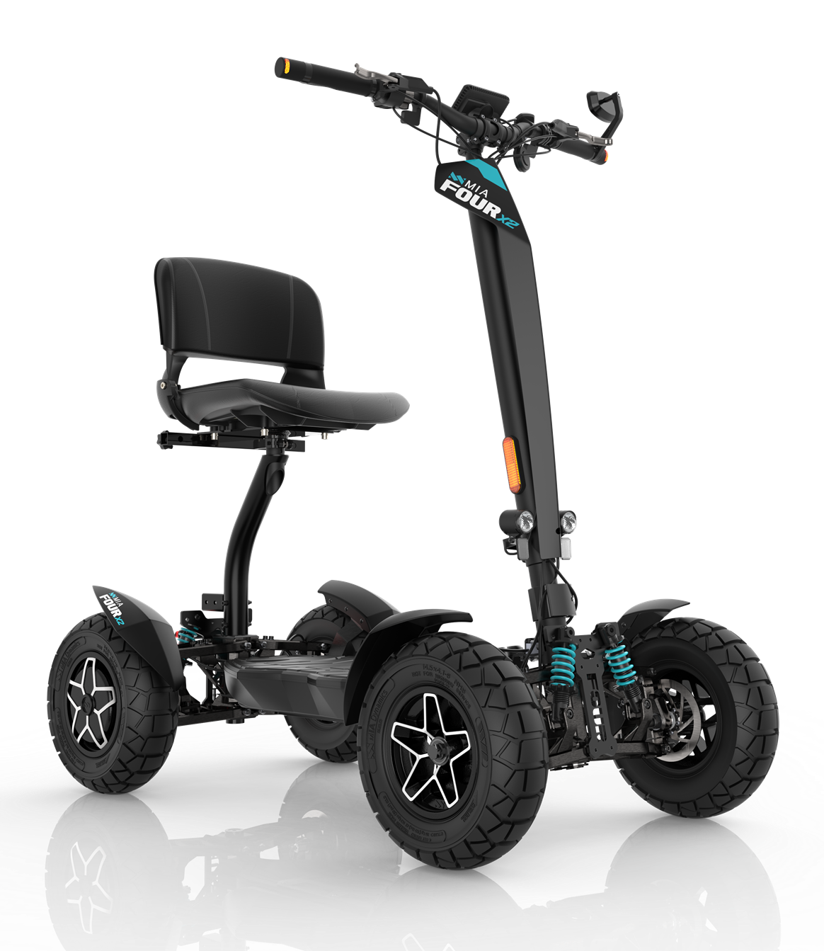 The powerful MIA FOUR X2 electric scooter with 4x2 drive, output of up to 7,200 W, a range of 100 km, and maximum stability thanks to four wheels.